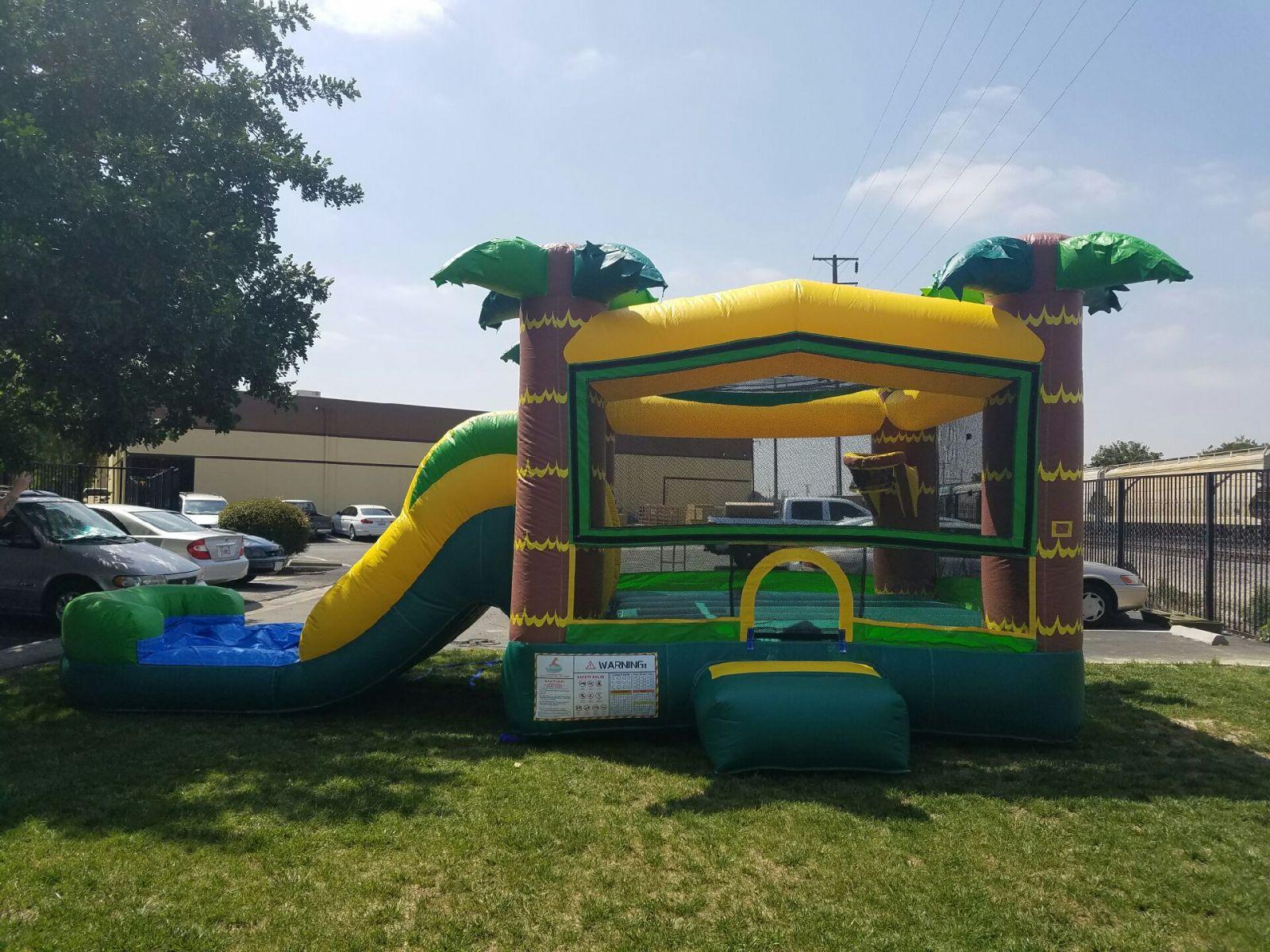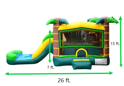This inflatable combo provides one of the best combo sizes for all ages specially for smaller children measuring 26 ft long x 13 ft wide x 15 feet high overall. This combo has a huge bounce area, a three-step climbing wall, a basketball hoop and a 7 ft slide with splash area. You can personalize this model with one of our banners as well.