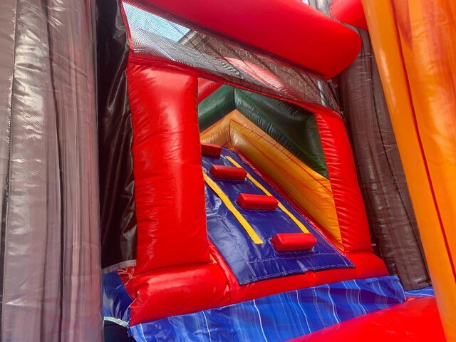 This waterslide features a 11x11 bounce area with a basketball hoop, popup pillars and large slide with a stopper.